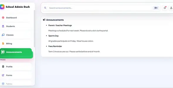 • Dashboard, Tables, Forms, Profile, Settings