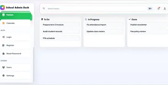 • Kanban (SortableJS), Calendar (FullCalendar)